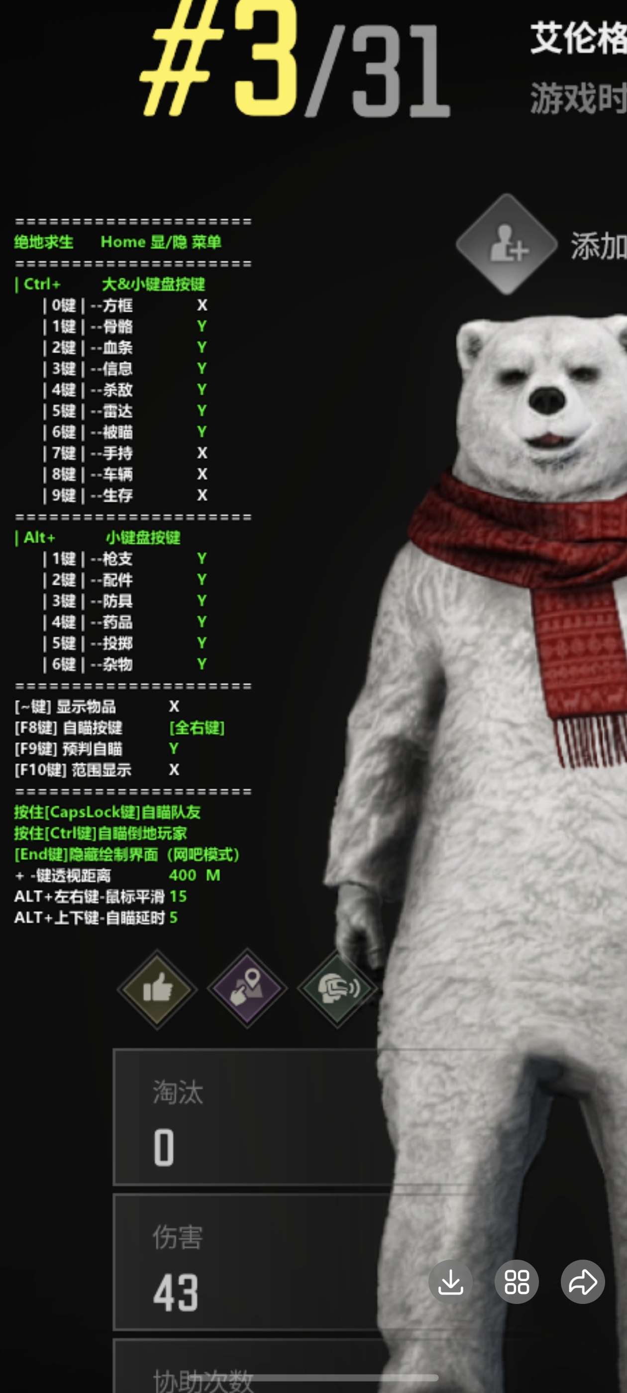 注:禁止使用F5 注意:每一局,出生地或落地必须按一次P键才有效果!不按没效果! 稳定性:小号娱乐 注:游戏必须无边框 辅助价格:8.8/8小时/18/天