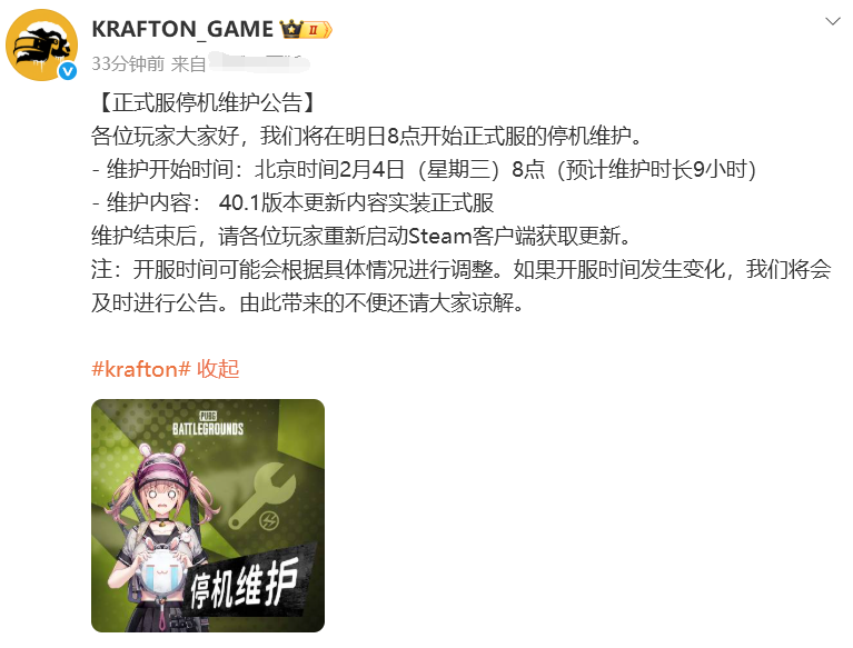 【正式服停机维护公告】 各位玩家大家好,我们将在明日8点开始正式服的停机维护。 - 维护开始时间:北京时间2月4日(星期三)8点(预计维护时长9小时)